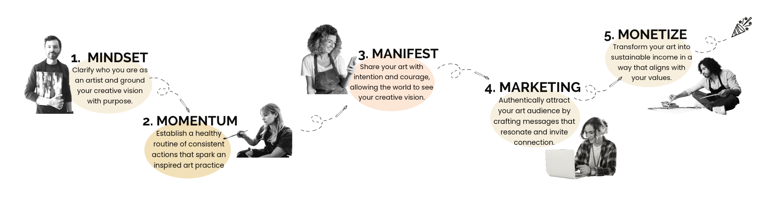 My signature Thrive Framework™ is your artful roadmap—five essential pillars that guide artists from hesitation to momentum, visibility, and sustainable income.