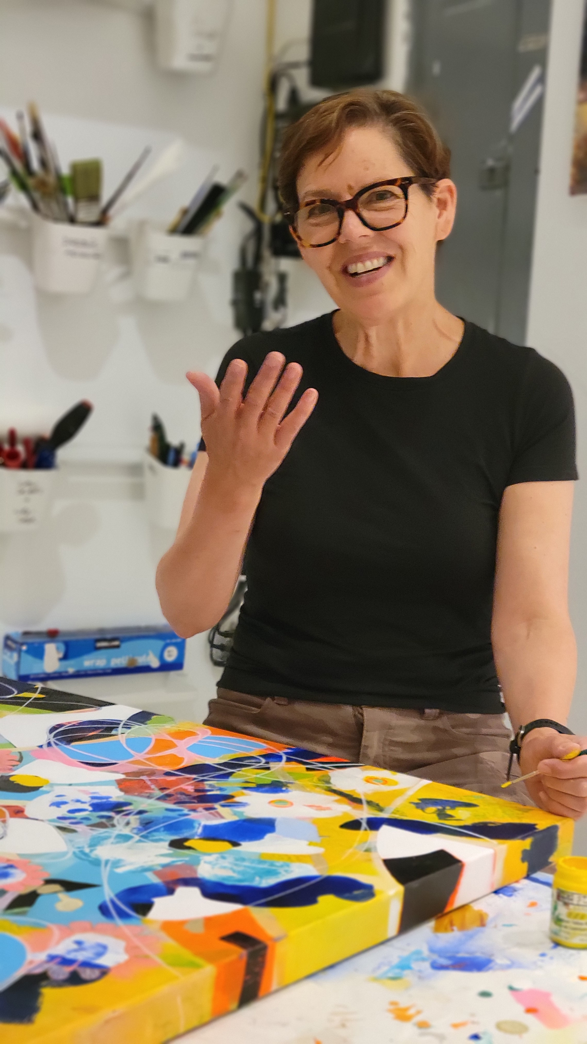 Valerie’s painting process begins with movement rather than planning. She starts by making a “mess” on the canvas, applying paint intuitively, responding to what appears, and allowing forms to emerge organically.